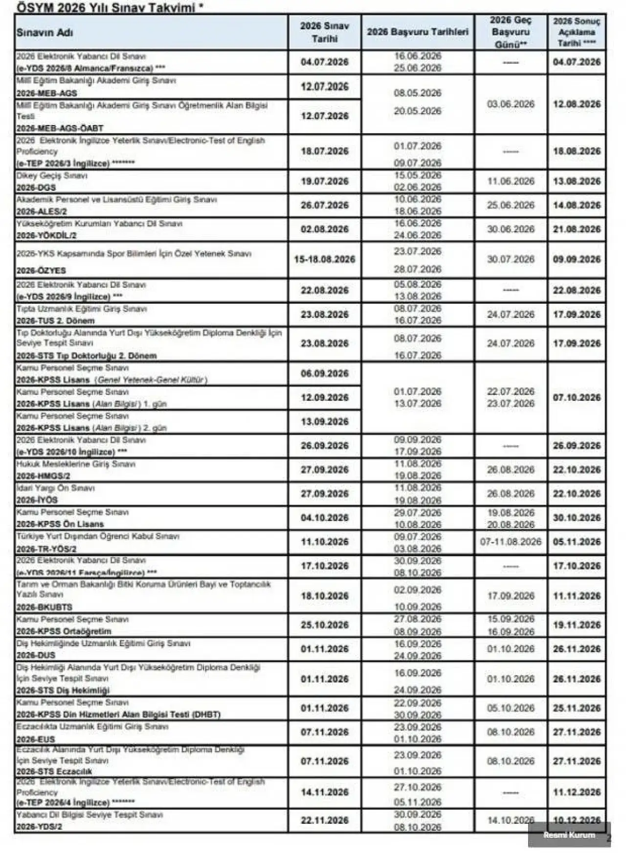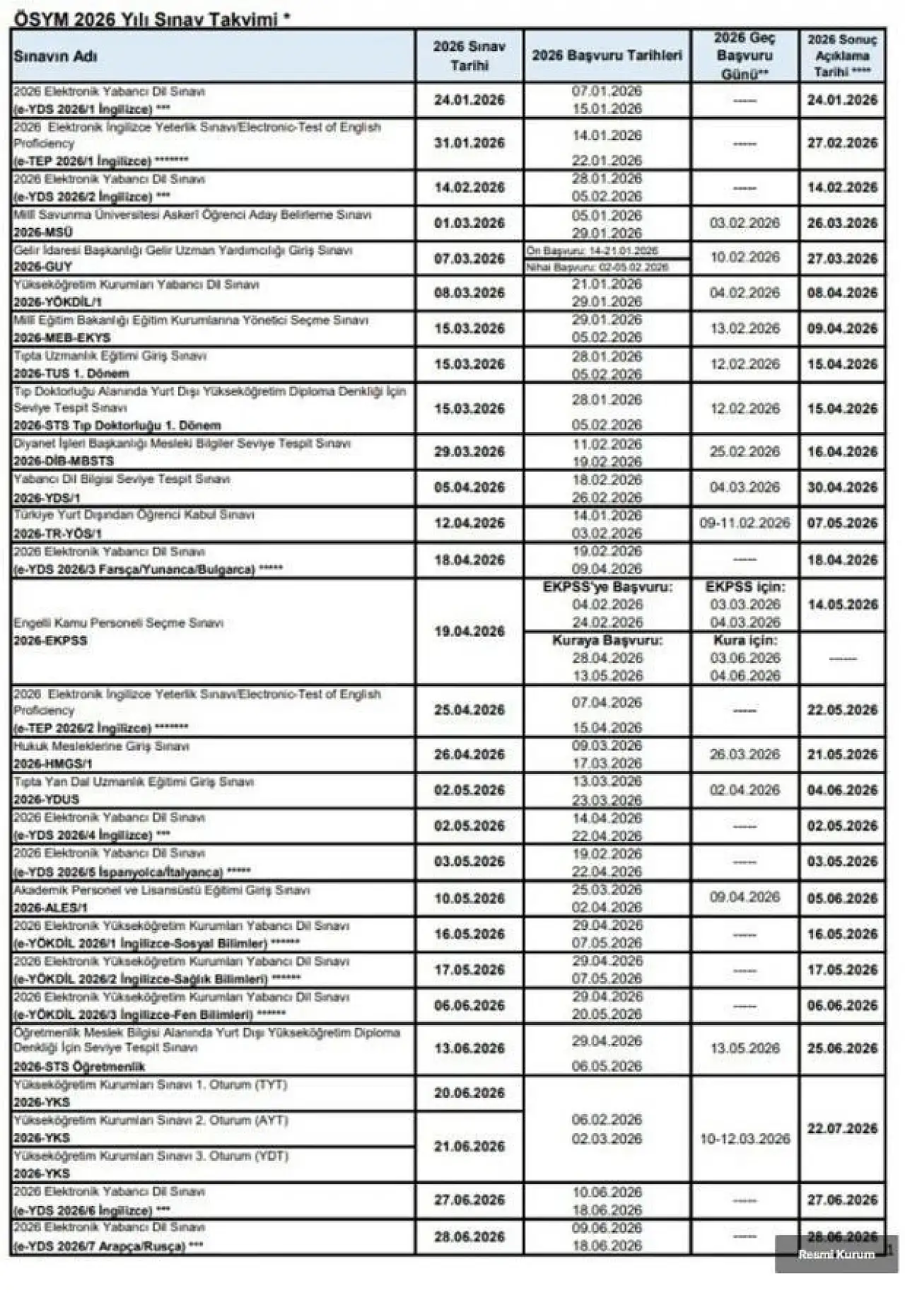 2026 ÖSYM Sınav Tarihleri