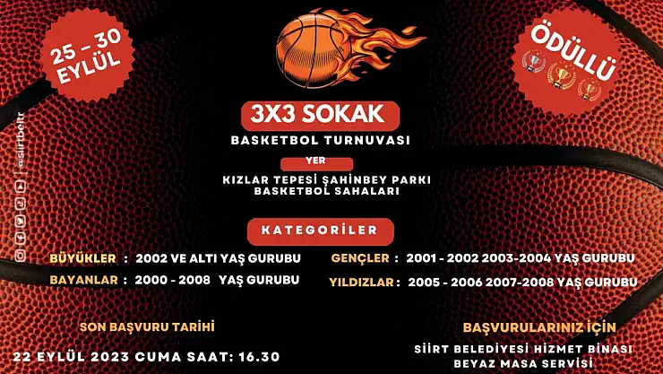 Vali Dr. Kemal Kızılkaya önderliğinde, Siirt Belediyesi Spor İşleri Müdürlüğü tarafından organize edilen "3x3 Sokak Basketbolu" turnuvası 4 kategoride başlıyor. Turnuvada dereceye giren takımlara toplamda 60 bin TL tutarında çeşitli hediyeler verilecek.