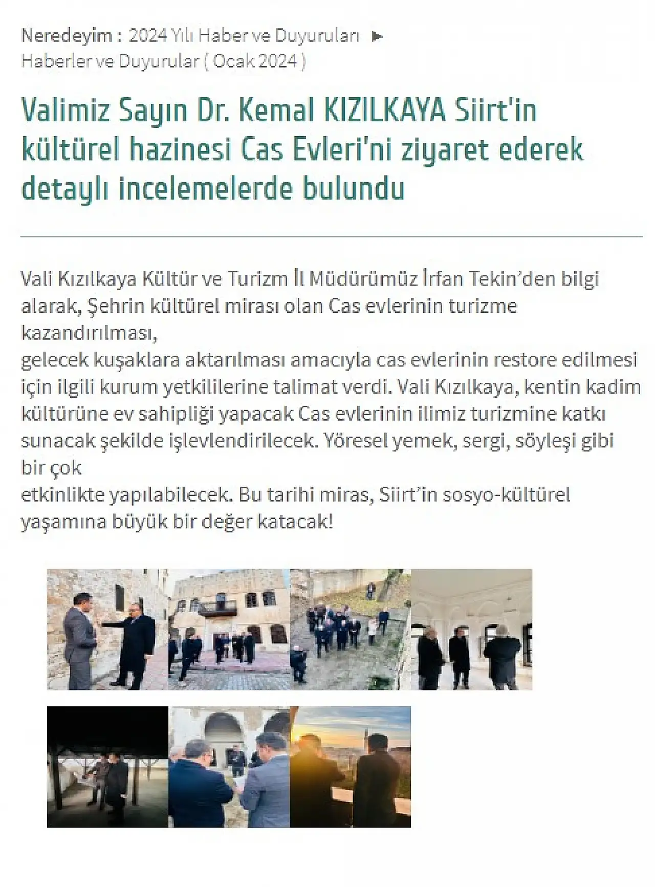 Oysa 2024 yılı Ocak ayında Siirt Valisi Dr. Kemal Kızılkaya, Cas evlerinde incelemelerde bulunarak bu kültürel mirasın turizme kazandırılması, gelecek kuşaklara aktarılması ve yöresel etkinliklerde kullanılabilmesi için ilgili kurumlara talimat vermişti. Cas evlerinin yöresel yemek, sergi ve kültürel etkinliklere ev sahipliği yapabilecek şekilde işlevlendirilmesi planlanmıştı.
