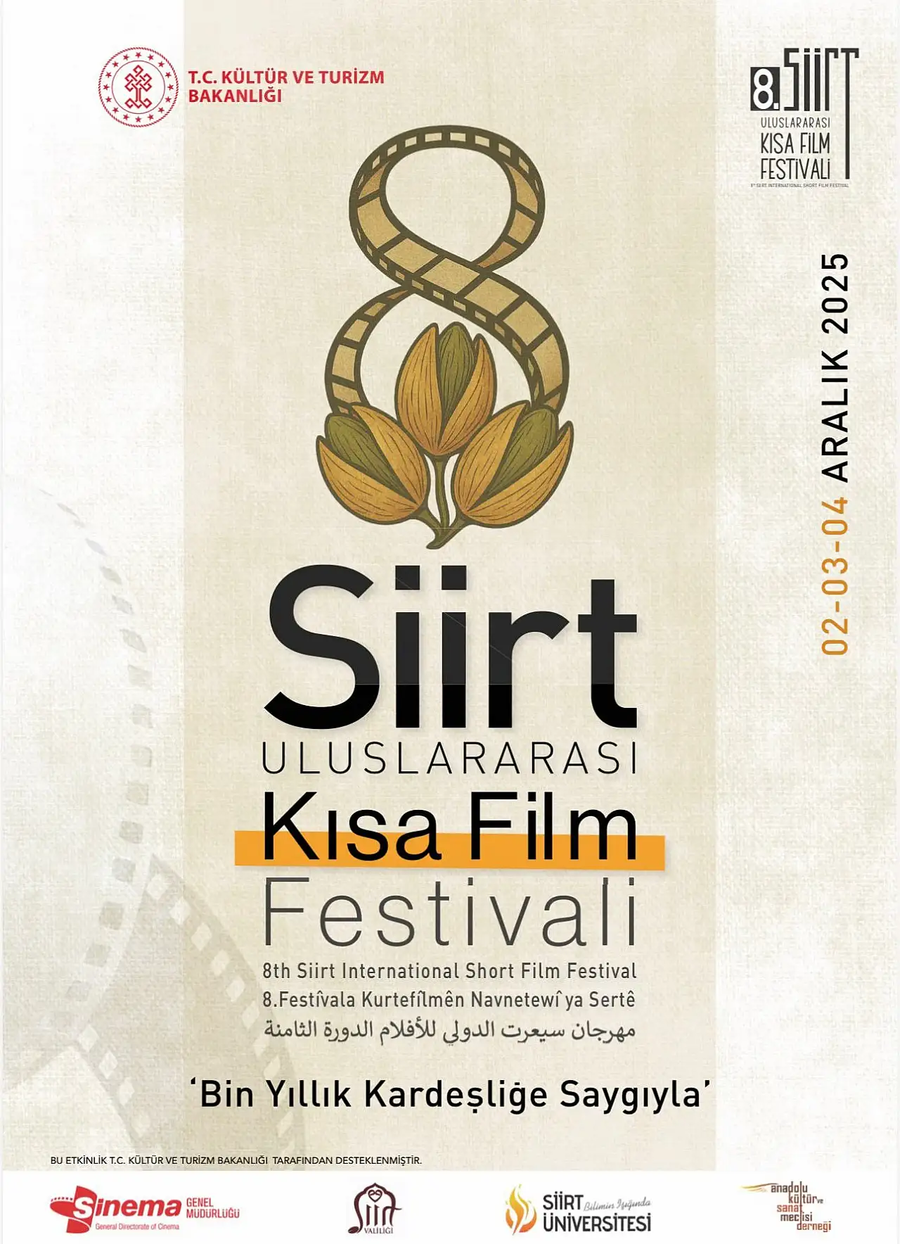 8. Siirt Uluslararası Kısa Film Festivali, bu yıl “Bin Yıllık Kardeşliğe Saygıyla” sloganıyla 2-3-4 Aralık 2025 tarihlerinde gerçekleştirilecek.