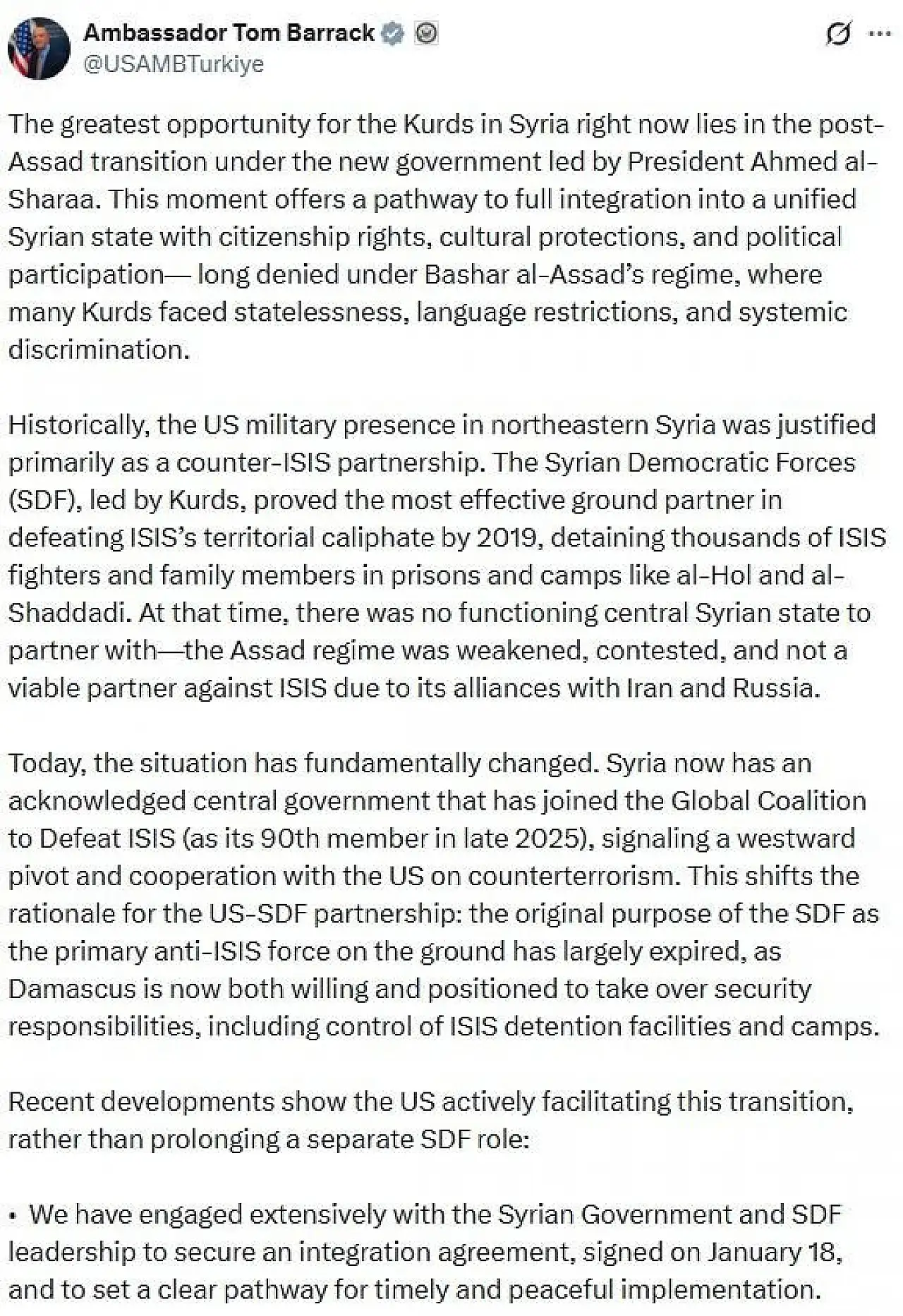 ABD’nin, SDG’nin ayrı bir rolünü sürdürmek yerine geçiş sürecini kolaylaştırdığını belirten Barrack, 18 Ocak’ta Suriye Hükümeti ile SDG arasında imzalanan entegrasyon anlaşmasına dikkat çekti. Anlaşma kapsamında;