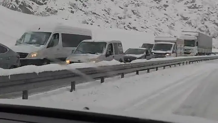 Kar yağışı nedeniyle trafik zaman zaman durma noktasına gelirken, özellikle ağır tonajlı araçların yolda kaldığı öğrenildi.