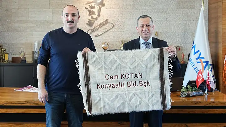 CHP Siirt Kurtalan İlçe Başkanı Orhan Karataş, Konyaaltı Belediye Başkanı Cem Kotan'ı ziyaret ederek Siirt kültürünü yansıtan, isminin yazılı olduğu tiftik halısını hediye etti.