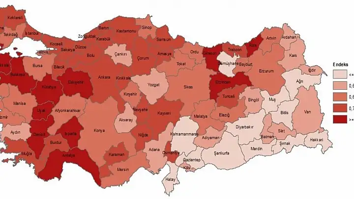 Buna karşılık batı illerinde Eskişehir (0,800), Çanakkale (0,790), Antalya (0,784), İzmir (0,777) gibi yüksek değerler kaydedildi.