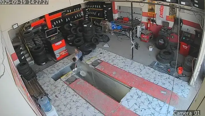 Mardin'in Mazıdağı ilçesinde bir oto lastikçiden çalışan çocuğun çukura düşme anı güvenlik kamerasına yansıdı.