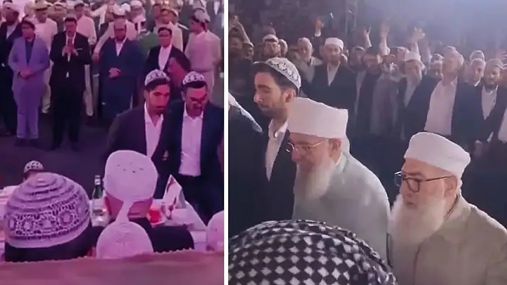 Şeyhin etrafında, sırtında 'Görevli' yazılı yelekler giyen cemaat üyelerinin koruma amaçlı yer alması da dikkat çeken detaylar arasında yer aldı.