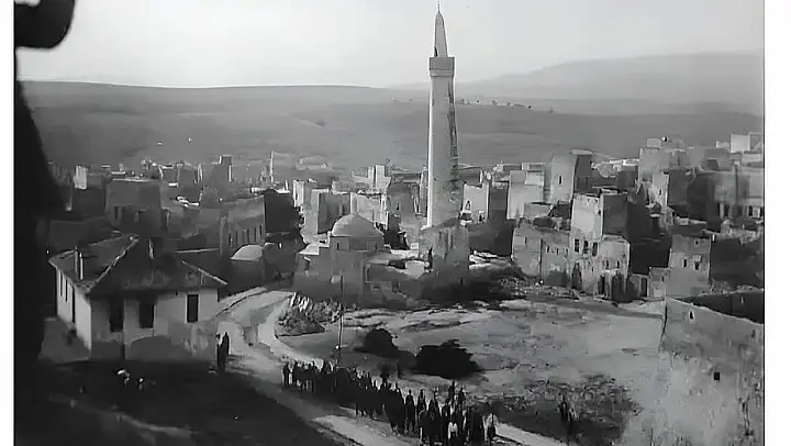 Kartta, sağda Babudarp Camisi ve minaresi, solda ise dönemin askeri fırın binası görülüyor. Fotoğrafın, kalabalık bir milli bayram dönüşünde çekilmiş olabileceği değerlendiriliyor. Ayrıca kadrajın sol kısmında muhtemelen askeri ya da sivil bir yetkilinin şapka veya kasketi dikkat çekiyor.