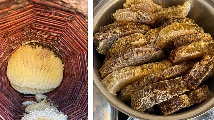 Devran Akın, kara kovan ürme sepetlerinin söğüt ağacından yapıldığını, dış kısmının çamurla sıvandığını ve iç kısmının tamamen temiz olduğunu belirtti. 'Balın mumu da tamamen doğal. Geleneksel üretim yöntemimiz, balımızın doğallığını garantiliyor' ifadelerini kullandı.
