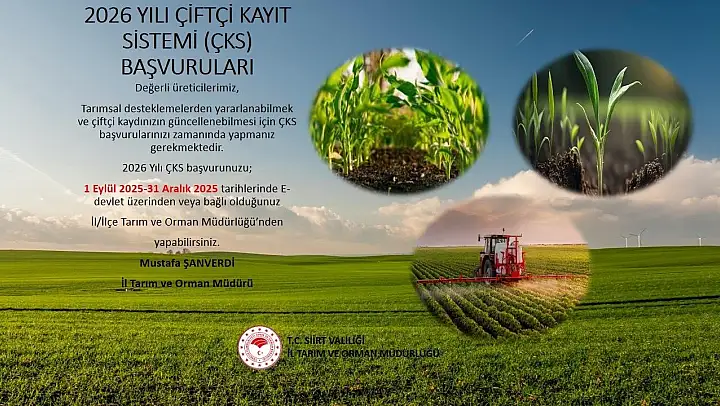 Siirt İl Tarım ve Orman Müdürlüğü, 2026 üretim yılına ilişkin Çiftçi Kayıt Sistemi (ÇKS) başvurularının başladığını açıkladı. Başvurular 1 Eylül 2025 itibarıyla alınmaya başlanmış olup, 31 Aralık 2025 tarihine kadar devam edecek.