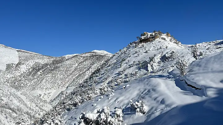 Yüzyıllardır dağların sessizliğinde ayakta duran İrun Kalesi, beyaz örtüyle birlikte adeta bir kış masalını andıran manzaraya büründü. Doğayla bütünleşen taş duvarlar, karın saflığıyla birleşerek izleyenleri geçmişin derinliklerine götürdü.