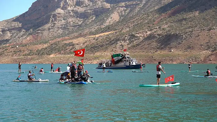 Botan Çayı'ndaki etkinlik, katılımcıların Filistin'e destek sloganları ve bayraklarla sona erdi.