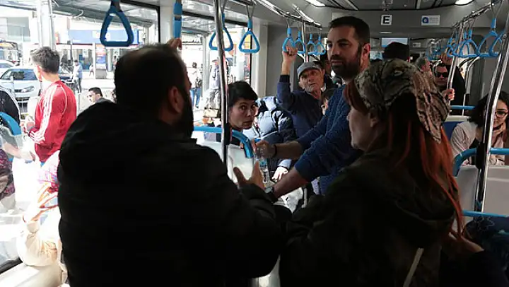 Tramvayda su krizi temalı skeç yolcuları şaşkına çevirdi