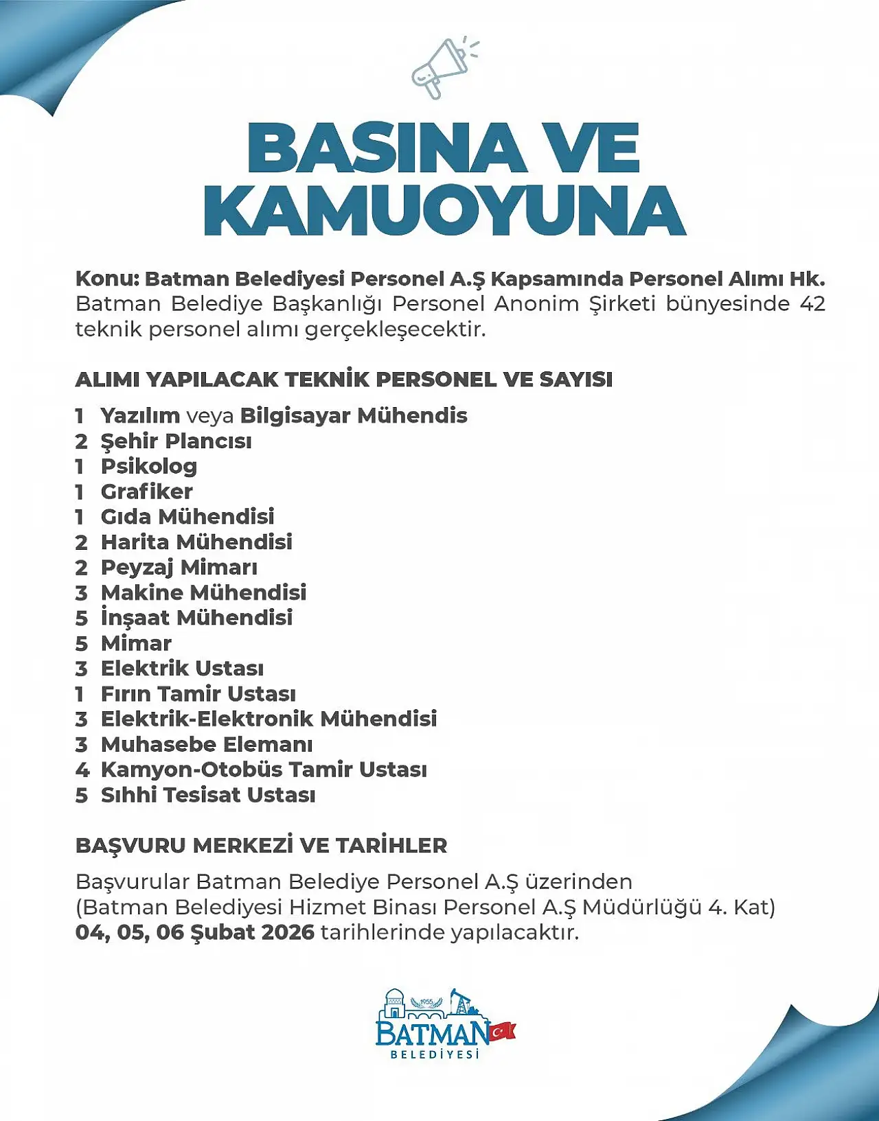 Adaylar, başvurularını 04, 05 ve 06 Şubat 2026 tarihlerinde Batman Belediyesi Hizmet Binası Personel A.Ş Müdürlüğü (4. Kat) üzerinden yapabilecek. Başvuruların şahsen alınacağı belirtildi.