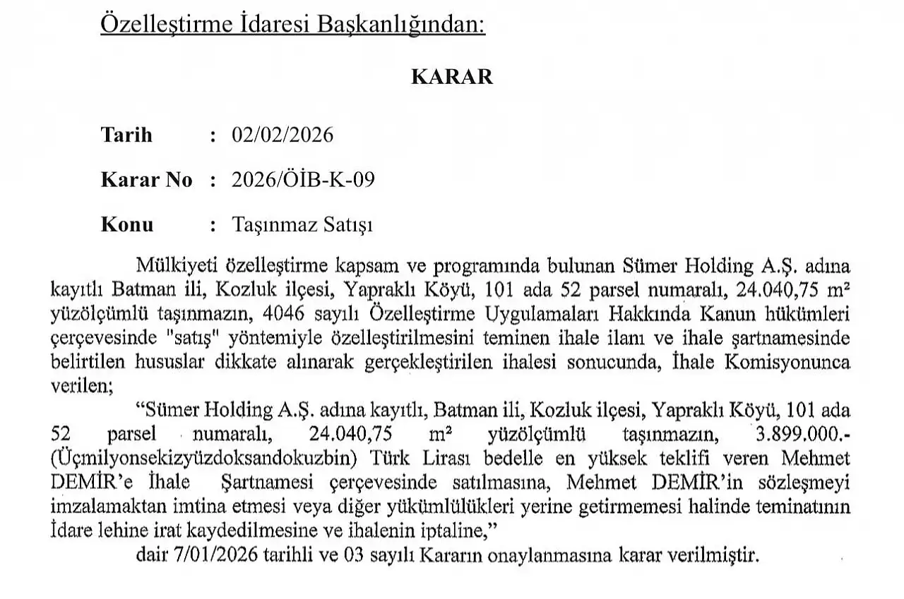02 Şubat 2026 tarihli ve 2026/ÖİB-K-09 sayılı karara göre; Batman ili Kozluk ilçesi Yapraklı Köyü sınırlarında yer alan, 101 ada 52 parsel numaralı ve 24 bin 040,75 metrekare yüzölçümüne sahip taşınmazın, 4046 sayılı Özelleştirme Uygulamaları Hakkında Kanun hükümleri çerçevesinde “satış” yöntemiyle özelleştirilmesi onaylandı.
