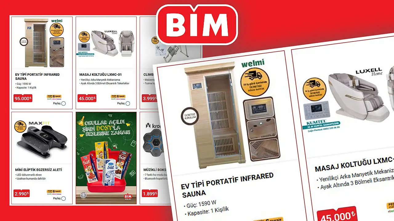 BİM marketin 22 Ekim 2025 aktüel ürünler kataloğu, sağlık, spor ve konfor odaklı dikkat çekici ürünlerle geliyor. Bu haftanın öne çıkan ürünleri arasında ev tipi infrared sauna, masaj koltuğu, tırmanma aleti, mini eliptik egzersiz cihazı ve müzikli boks makinesi yer alıyor. İşte 22 Ekim BİM aktüel kataloğunda yer alan ürünlerin özellikleri ve fiyatları: