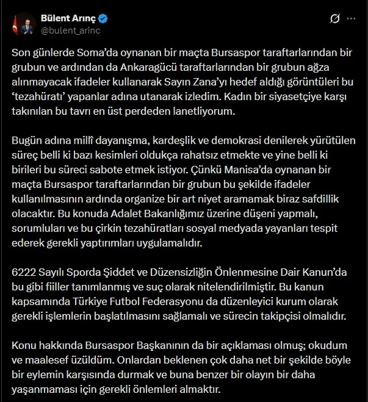 22. Dönem TBMM Başkanı Bülent Arınç, Soma'da oynanan bir maçta Leyla Zana'yı hedef alan hakaret içerikli tezahüratlara sert sözlerle tepki gösterdi. Arınç, yaşananları 'utanç verici' olarak nitelendirerek, kadın bir siyasetçiye yönelik bu dili en güçlü şekilde kınadığını ifade etti.