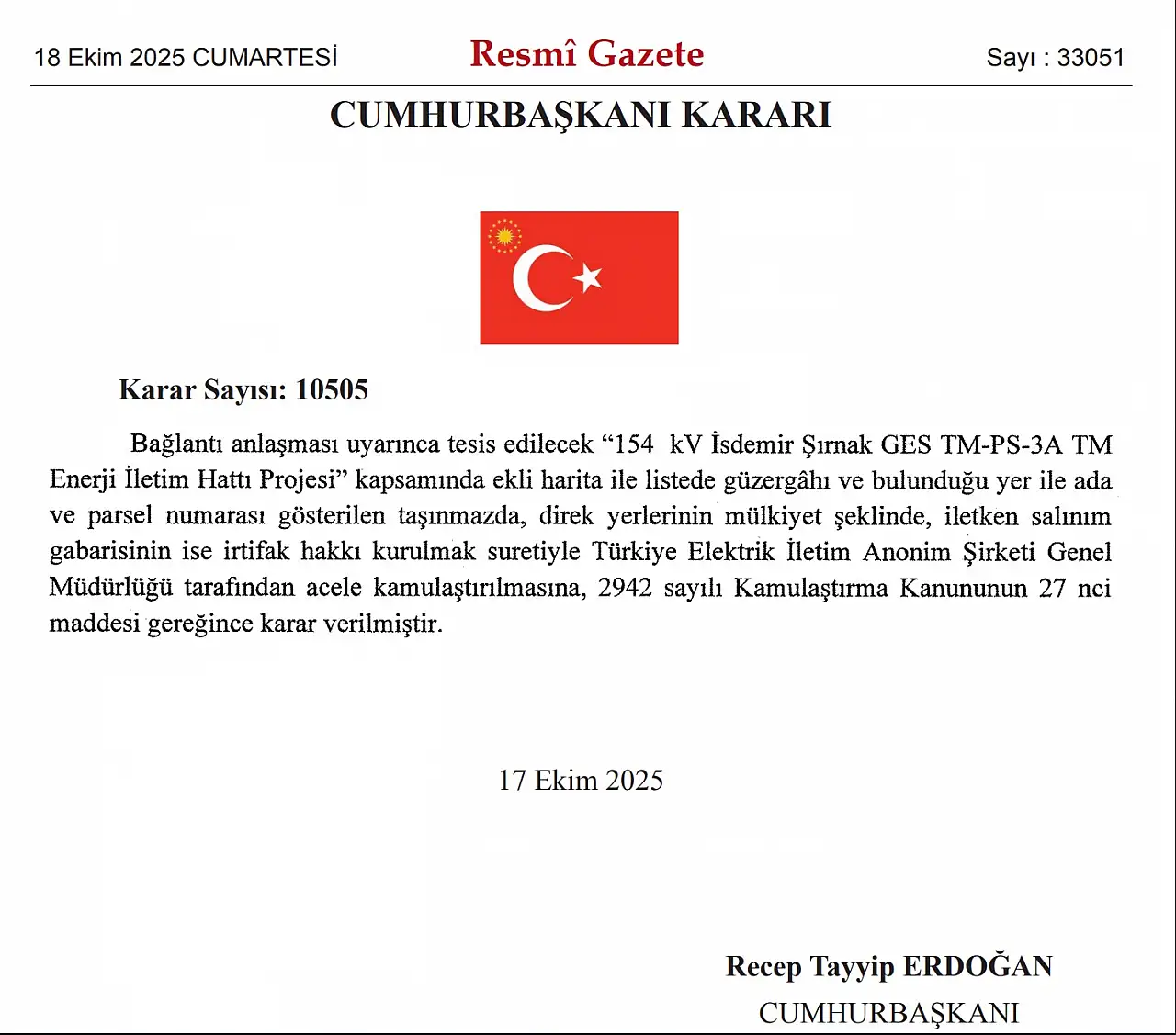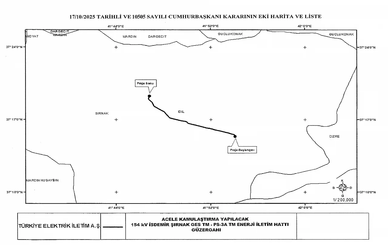 Cumhurbaşkanı Recep Tayyip Erdoğan'ın imzasıyla yayımlanan 10505 sayılı Cumhurbaşkanı Kararı ile, Şırnak'ta yapılacak '154 kV İsdemir Şırnak GES TM-PS-3A TM Enerji İletim Hattı Projesi' kapsamında bazı taşınmazların acele kamulaştırılmasına karar verildi.