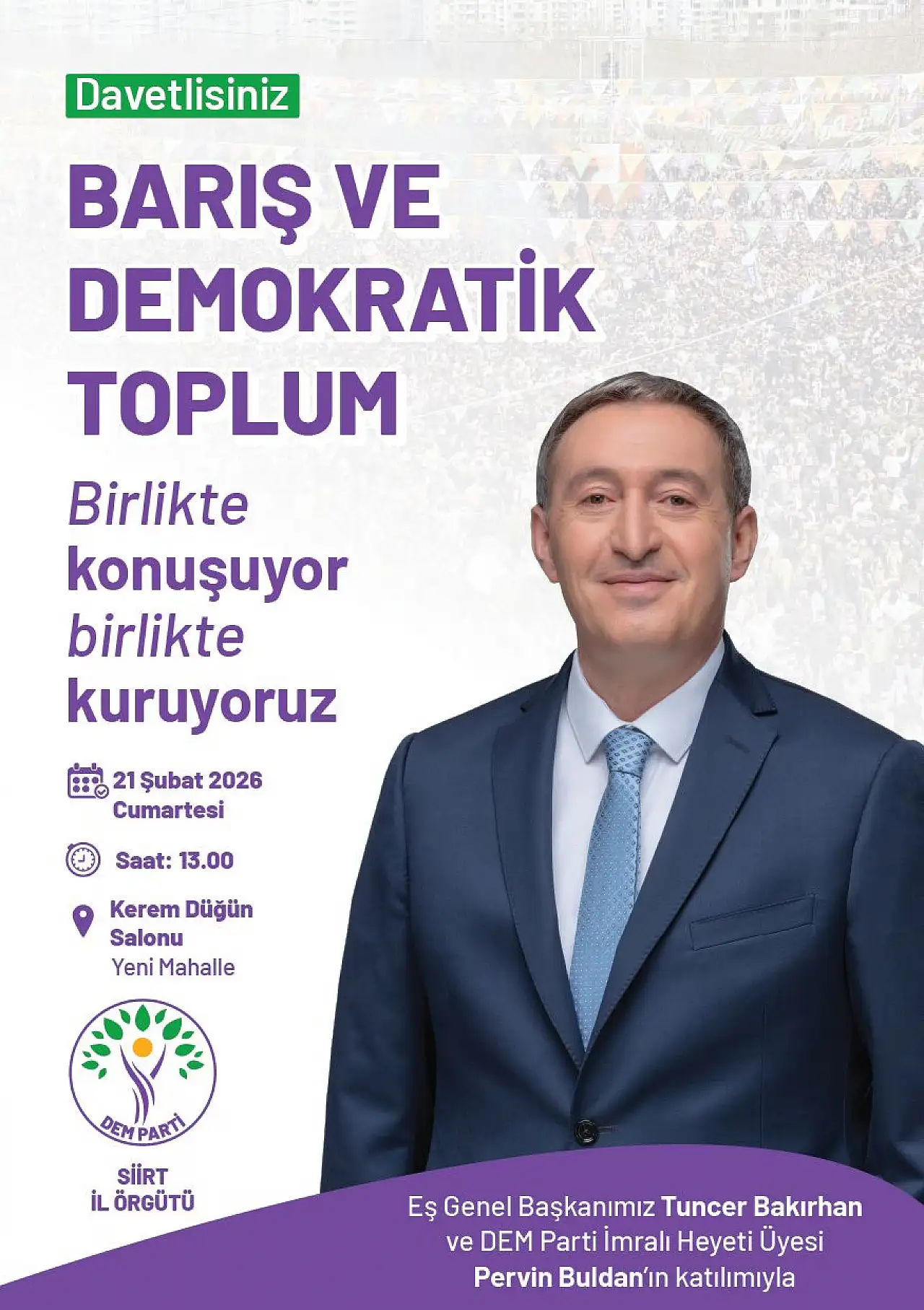 “Barış ve Demokratik Toplum” başlığıyla gerçekleştirilecek buluşma, 21 Şubat 2026 Cumartesi günü saat 13.00’te Yeni Mahalle’de bulunan Kerem Düğün Salonu’nda yapılacak.