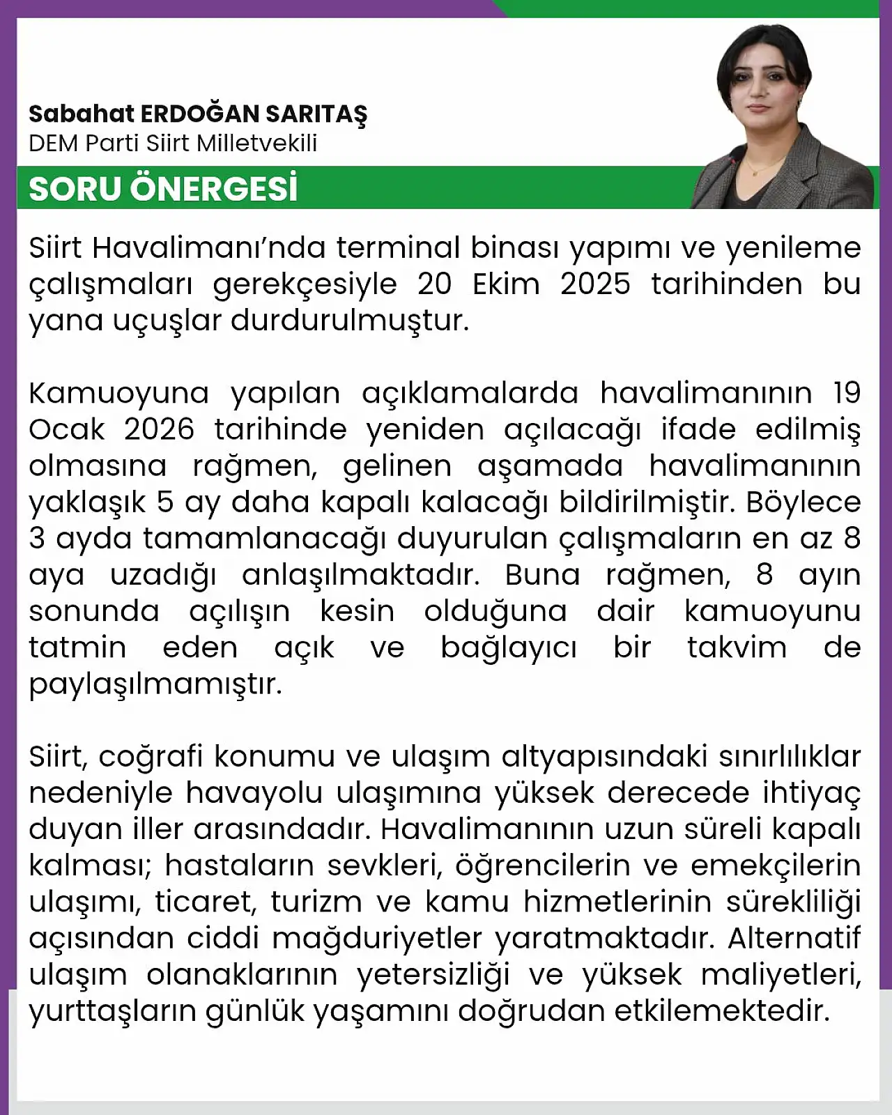 Sarıtaş’ın önergesinde, Siirt Havalimanı’ndaki terminal binası yapım ve yenileme çalışmaları nedeniyle 20 Ekim 2025 tarihinden bu yana uçuşların durdurulduğu hatırlatıldı. Kamuoyuna yapılan açıklamalarda havalimanının 19 Ocak 2026 tarihinde yeniden açılacağının ifade edildiğini belirten Sarıtaş, gelinen aşamada havalimanının yaklaşık 5 ay daha kapalı kalacağının bildirildiğini kaydetti. Böylece 3 ayda tamamlanacağı belirtilen çalışmaların en az 8 aya uzadığına dikkat çekti.