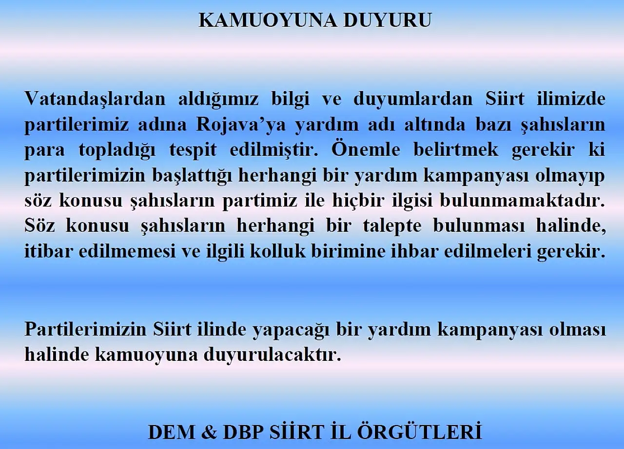 DEM Parti ve DBP Siirt İl Örgütleri, 'Rojava'ya yardım' adı altında para toplayan kişilere karşı vatandaşları uyardı.