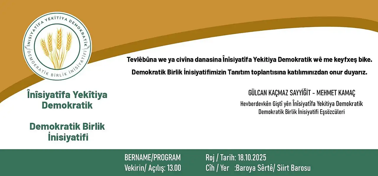 Demokratik Birlik İnisiyatifi (Înisiyatîfa Yekîtiya Demokratik), yarın Siirt Barosu Toplantı Salonu'nda düzenlenecek programla kamuoyuna tanıtılacak.