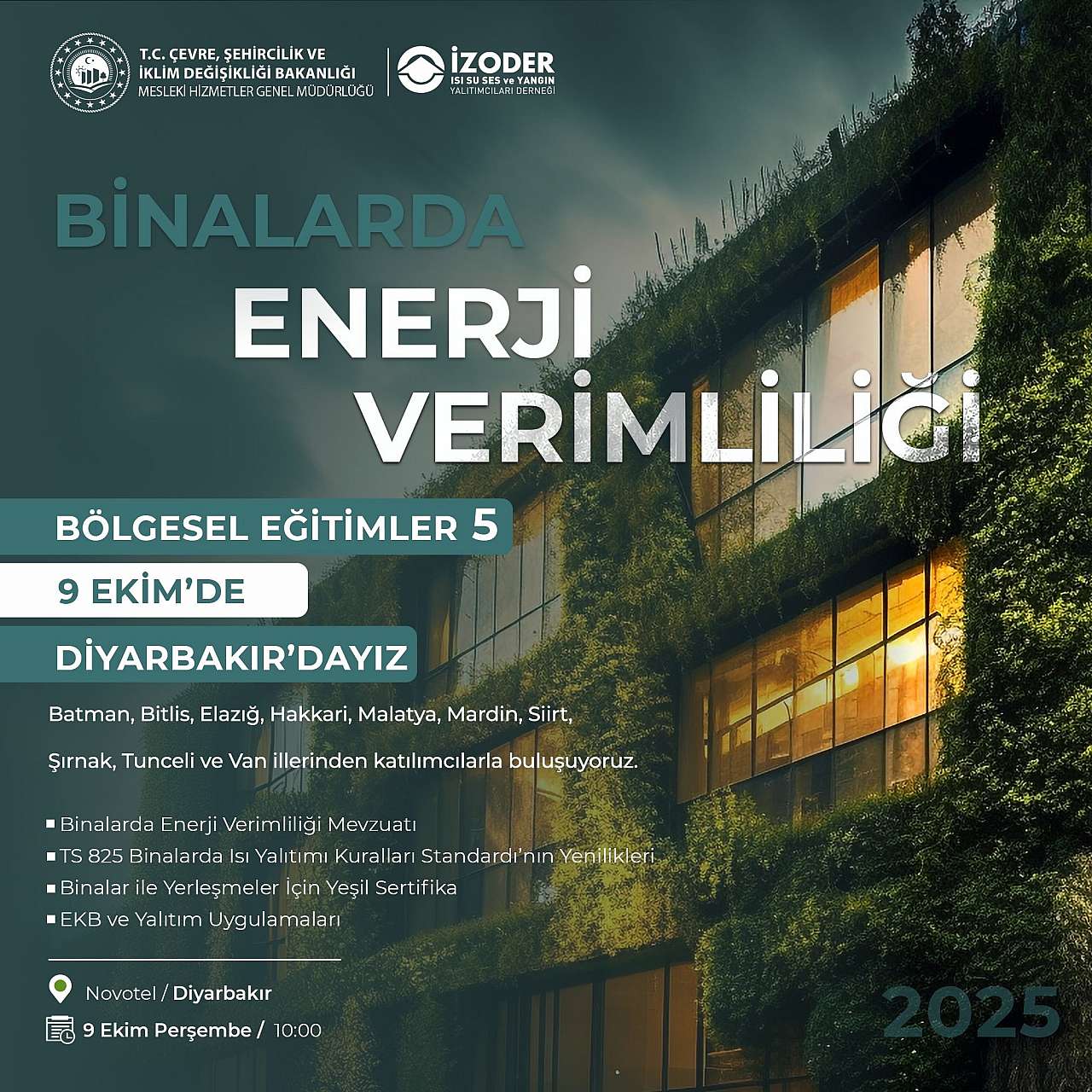 Mesleki Hizmetler Genel Müdürlüğü’nün duyurusuna göre, 9 Ekim’de Diyarbakır’da düzenlenecek Binalarda Enerji Verimliliği Bölgesel Eğitimi etkinliği kapsamında, Batman, Bitlis, Diyarbakır, Elazığ, Hakkari, Malatya, Mardin, Siirt, Şırnak, Tunceli ve Van illerinden ilgili idarelerin ruhsat ve yapı kullanma izin birimleri, meslek odaları, yapı denetim kuruluşları, malzeme üreticileri ve proje müellifleri biraraya gelecek.