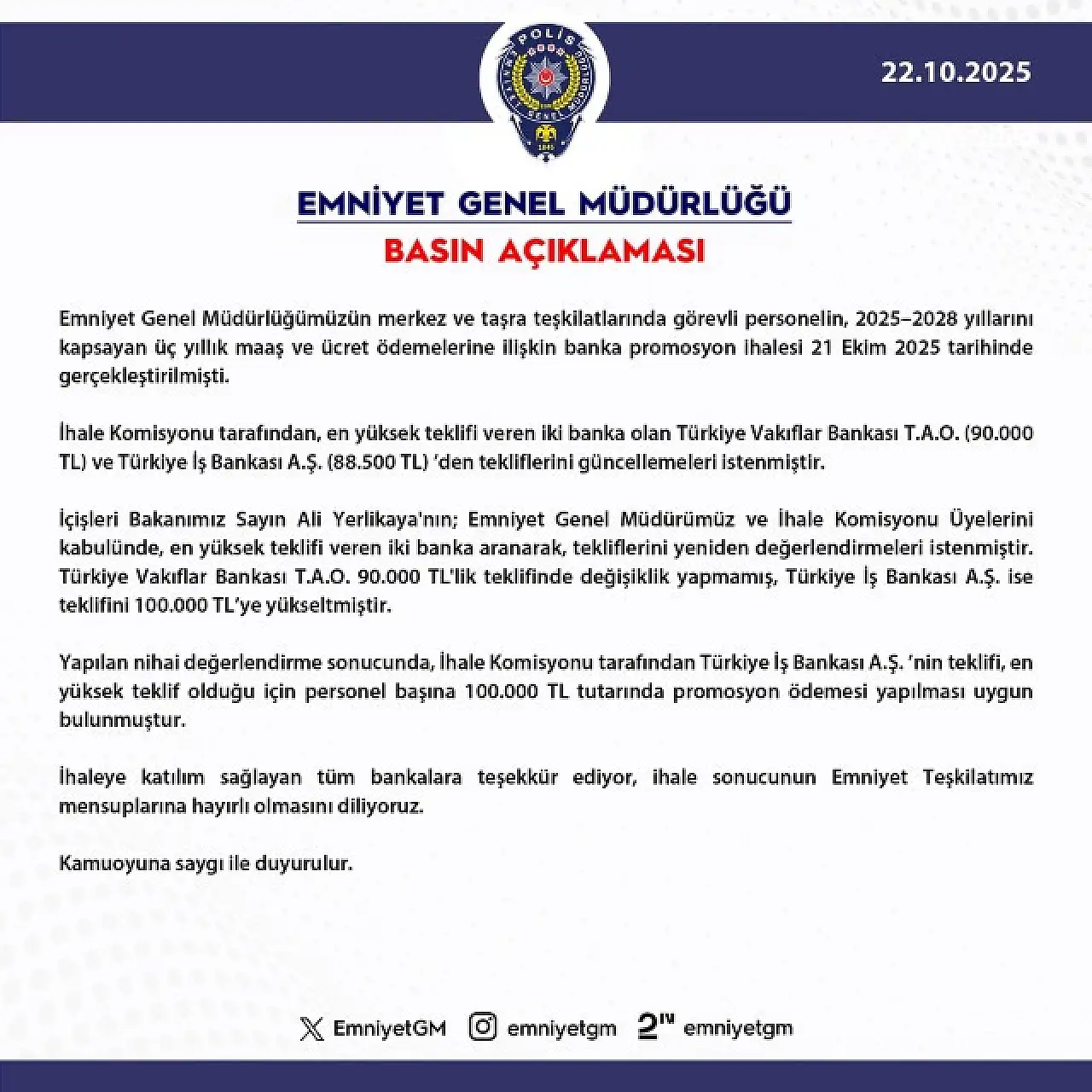 - Emniyet Genel Müdürlüğü 2025-2028 Maaş Promosyonu İhalesi Sonuçlandı: Polisler Kişi Başı 100 Bin TL Ödenecek