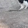 Siirt'in Kurtalan ilçesinde kedi, fareyle oynar gibi yılanla bir süre oynadıktan sonra, hayvanı ağzıyla kapıp uzaklaştı. O anlar cep telefonu kamerasına yansıdı.