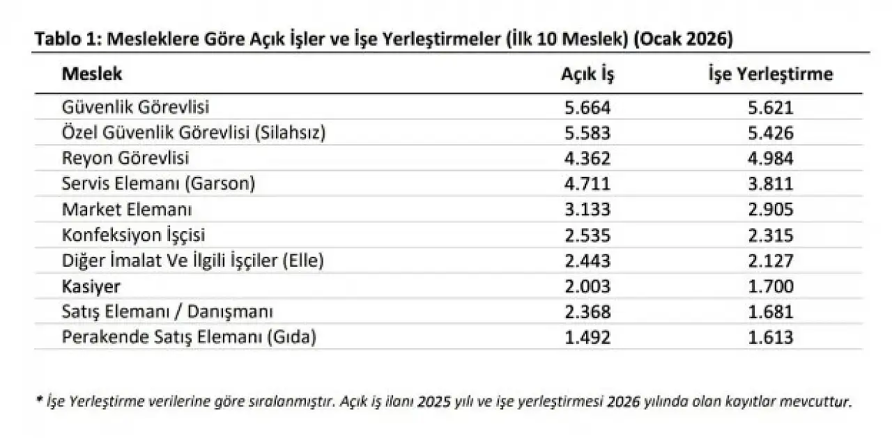 Güvenlik görevliliği hem açık iş sayısı hem de işe yerleştirme bakımından ilk sırada yer aldı. Perakende ve hizmet sektöründe ise açık iş sayıları ile yerleştirme sayılarının birbirine yakın olması, bu alanlarda sürekli bir iş gücü talebi olduğunu gösterdi.