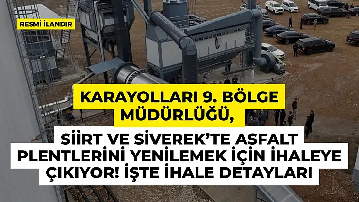 - Karayolları 9. Bölge Müdürlüğü, Siirt ve Siverek'te Asfalt Plentlerini Yenilemek İçin İhaleye Çıkıyor! İşte İhale Detayları