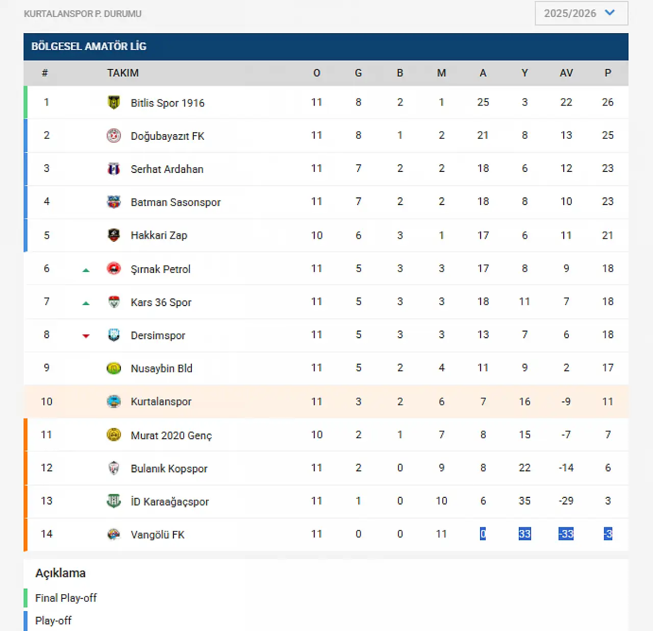 Kurtalanspor lig'de 10'uncu sırada yer alıyor.