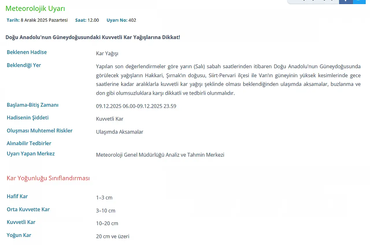 Meteoroloji, Siirt’in Pervari ilçesinin yanı sıra Hakkari, Şırnak’ın doğusu ile Van’ın güneyinin yüksek bölgelerinde de kar yağışının 10–20 cm arasında olabileceğini belirterek “Kuvvetli Kar” kategorisinde uyarı yaptı.