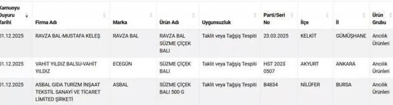 Tarım ve Orman Bakanlığı, taklit ve tağşiş yapıldığı belirlenen bal markalarına yönelik yeni listesini kamuoyuyla paylaştı. Yapılan denetimlerde sağlığı tehdit ettiği tespit edilen ürünler arasında Ravza Bal, Asbal ve daha önce de ifşa edilen Ecegün çiçek balı yer aldı.