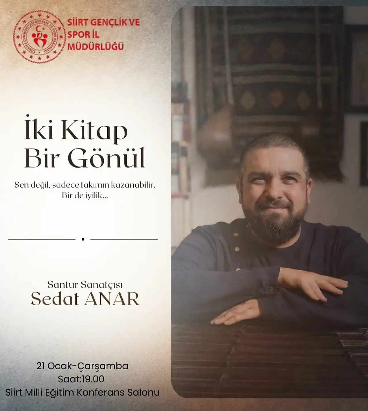Siirt Gençlik ve Spor İl Müdürlüğü tarafından yürütülen “İki Kitap Bir Gönül” projesi kapsamında, ülkemizin sevilen santur sanatçılarından Sedat Anar, Siirt’te sahne alacak.