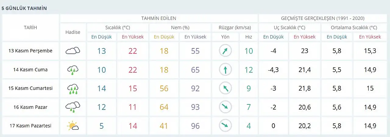 Yağışların ardından 16 Kasım Pazar günü parçalı bulutlu, 17 Kasım Pazartesi günü ise az bulutlu bir hava bekleniyor. Meteoroloji yetkilileri, yağışların yer yer kuvvetli olabileceğini belirterek vatandaşları dikkatli olmaları konusunda uyardı.