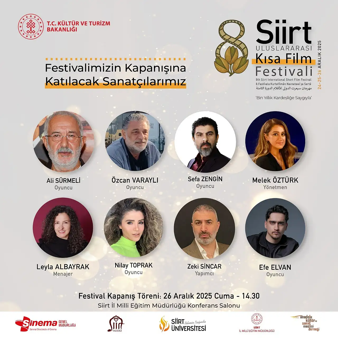 T.C. Kültür ve Turizm Bakanlığı'nın katkılarıyla bu yıl 8'incisi düzenlenen Siirt Uluslararası Kısa Film Festivalinin kapanış törenine katılacak sanatçılar belli oldu. 24–26 Aralık 2025 tarihleri arasında gerçekleştirilen festival, sinema dünyasından önemli isimleri Siirt'te bir araya getirdi.