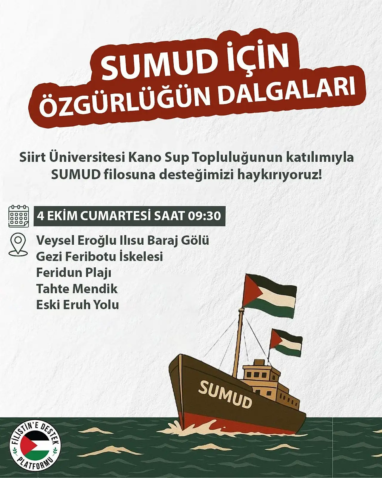 Siirt’in Botan Vadisi’nde Filistin’e destek amacıyla anlamlı bir etkinlik gerçekleştirilecek. Siirt Üniversitesi Kano-SUP Topluluğu’nun katılımıyla yapılacak etkinlikte, “Özgürlüğün Dalgaları” sloganıyla Sumud Filosu’na destek verilecek.