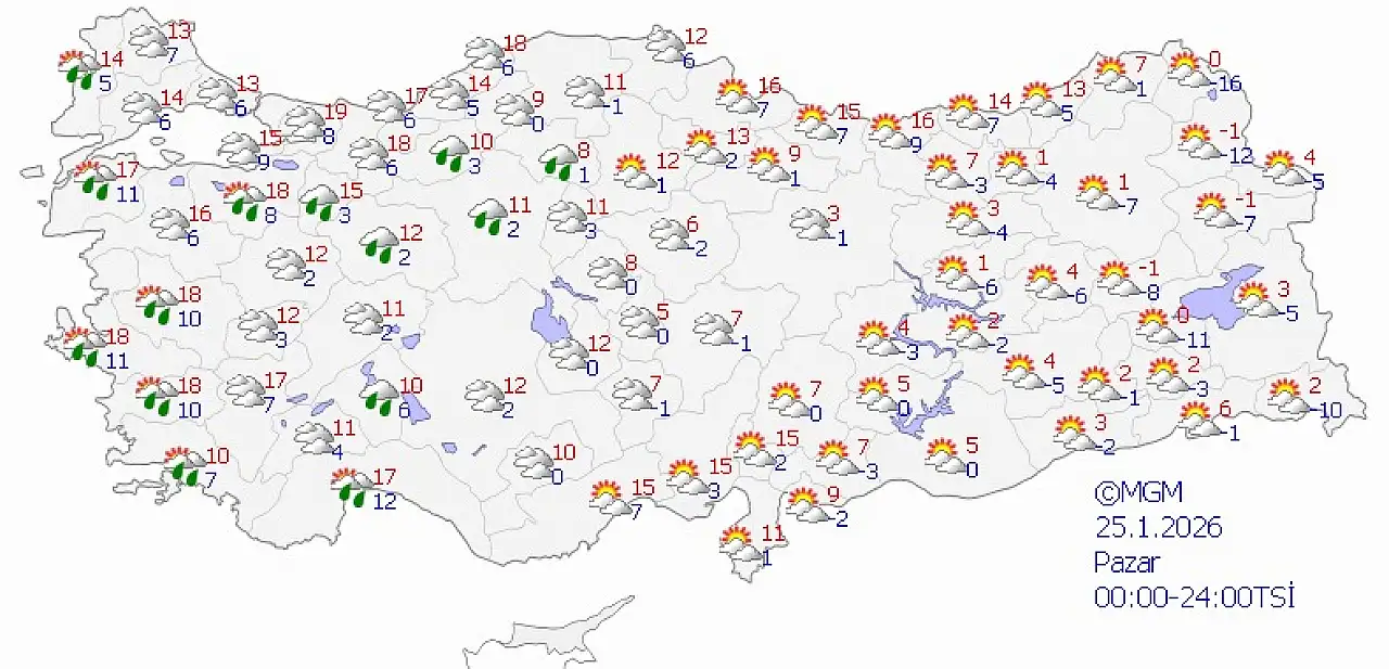Pazar günü az bulutlu bir hava bekleniyor. En düşük sıcaklık -6 derece, en yüksek sıcaklık ise 1 derece olacak. Soğuk ve ayaz hava özellikle sabah saatlerinde etkili olacak.