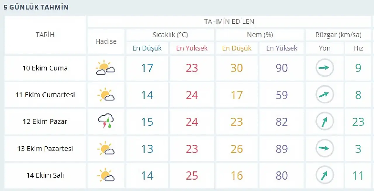 11 Ekim Cumartesi günü havanın az bulutlu geçmesi, sıcaklıkların 14 ile 24 derece arasında seyretmesi bekleniyor. Ancak 12 Ekim Pazar günü gökgürültülü sağanak yağış kente yeniden dönüş yapacak. En düşük sıcaklık 15, en yüksek sıcaklık ise 24 derece olacak.