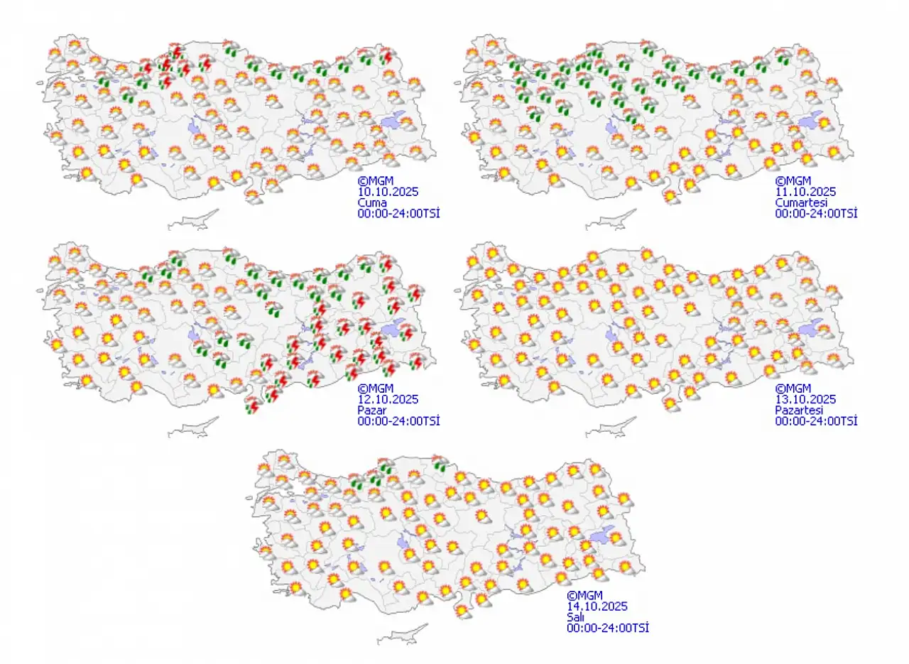 Yeni haftanın ilk günlerinde hava tekrar açacak. 13 Ekim Pazartesi ve 14 Ekim Salı günleri az bulutlu hava beklenirken sıcaklıklar 23-25 derece civarında olacak.