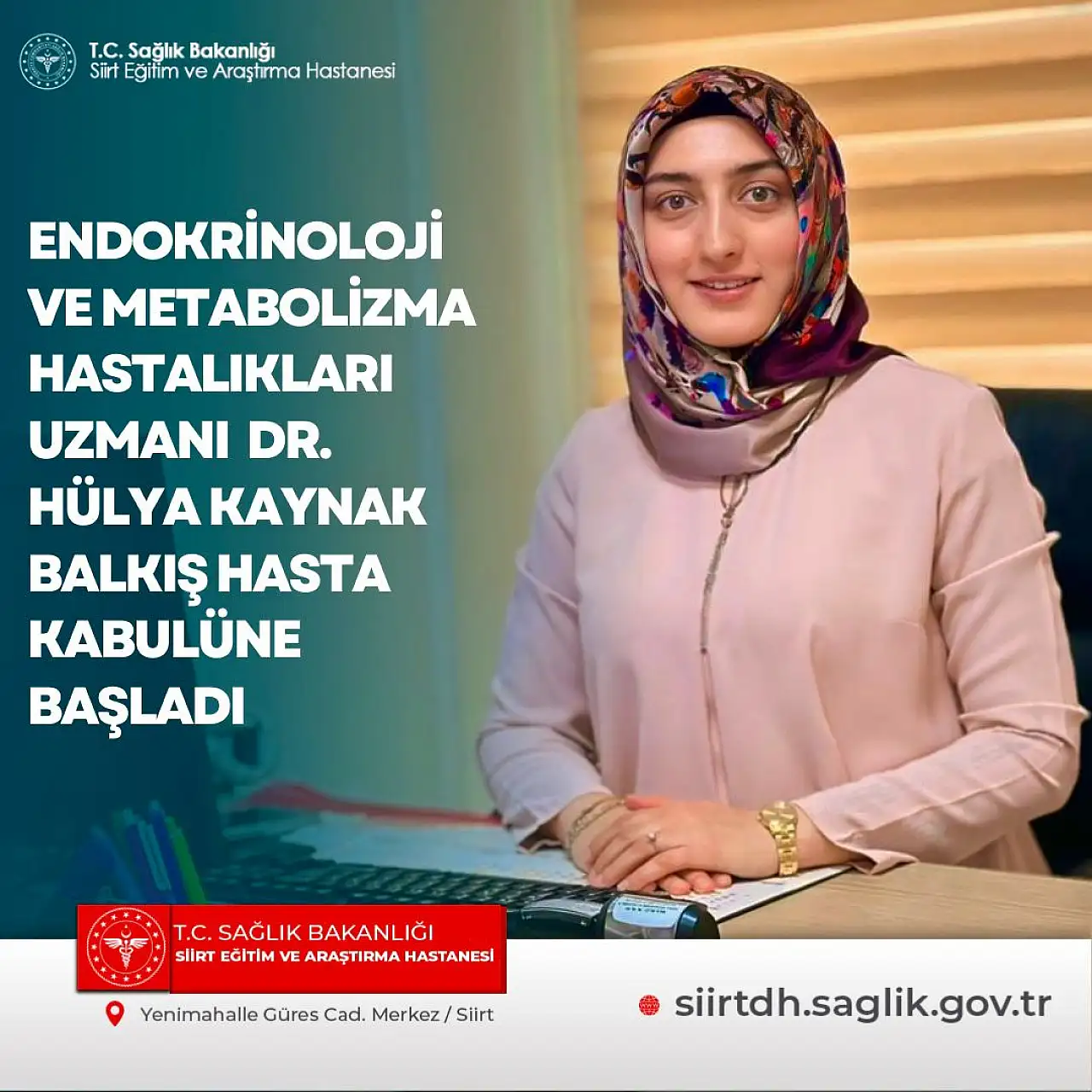Siirt Eğitim ve Araştırma Hastanesi, yeni bir uzman hekimi daha kadrosuna kattı. Endokrinoloji ve Metabolizma Hastalıkları Uzmanı Dr. Hülya Kaynak Balkış, 125. Dönem Devlet Hizmeti Yükümlülüğü kapsamında hastaneye atanarak hasta kabulüne başladı.