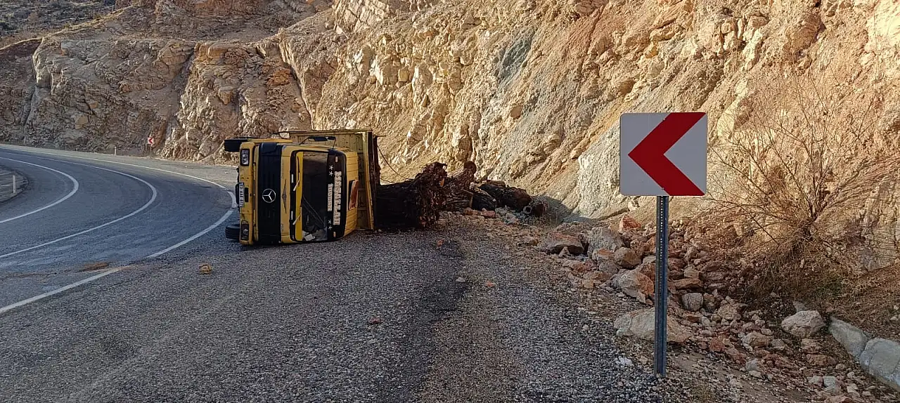 Kaza nedeniyle kamyonda maddi hasar oluşurken, devrilen araçtaki odunlar yol kenarına savruldu. Kazayla ilgili inceleme başlatıldı.