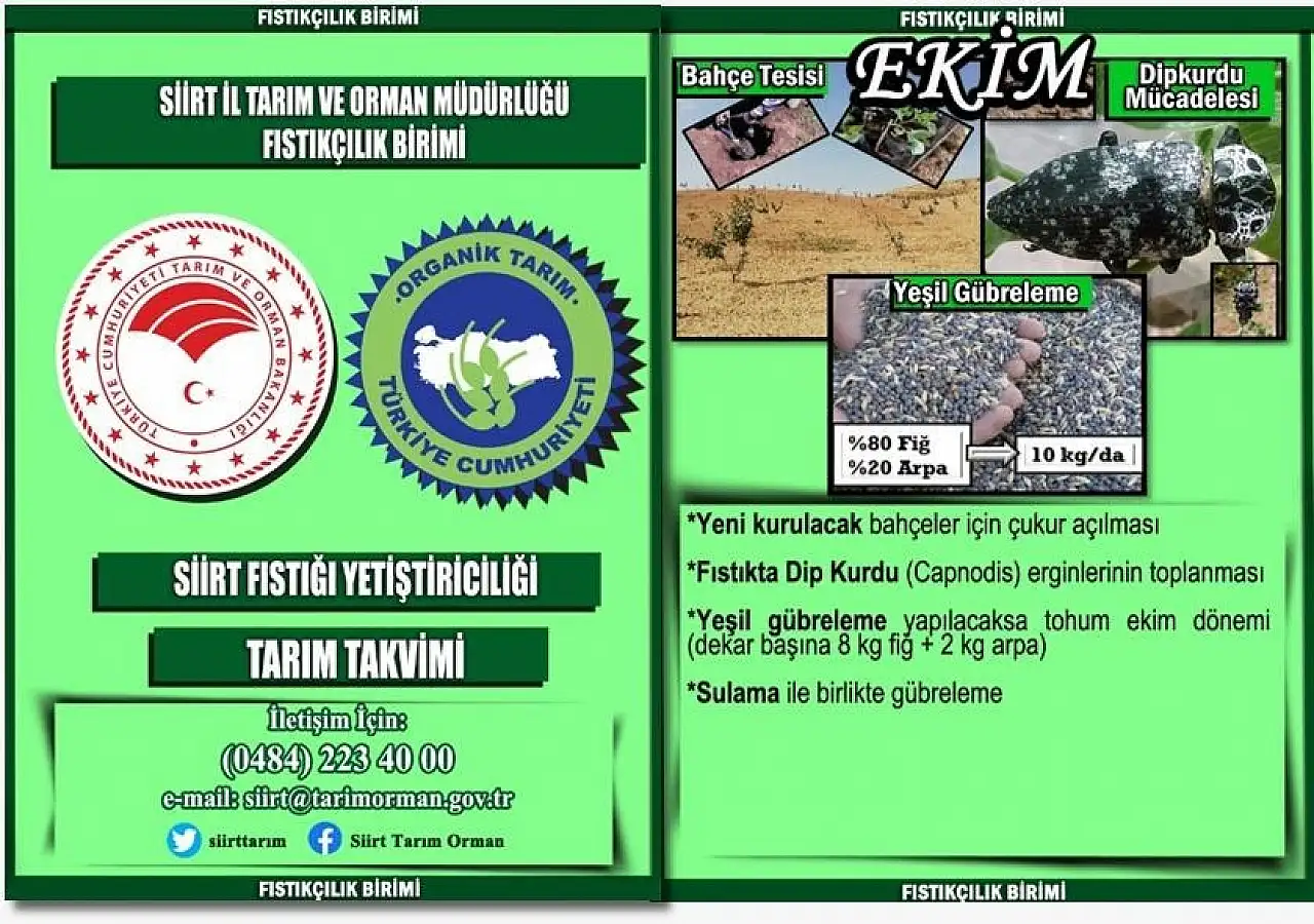 Siirt İl Tarım ve Orman Müdürlüğü Fıstıkçılık Birimi, Siirt fıstığı yetiştiriciliğinde Ekim ayı için tarım takvimini duyurdu. İl müdürlüğü tarafından paylaşılan bilgiler, bölge çiftçileri için yol gösterici nitelikte.