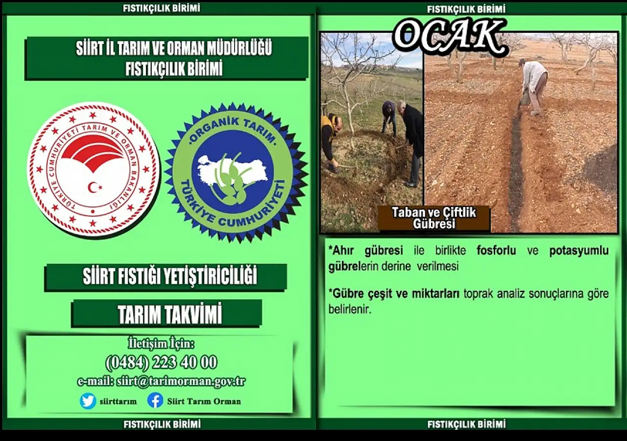Fıstıkçılık Birimi, ocak ayının Siirt fıstığında taban gübresi uygulaması için en uygun dönemlerden biri olduğunu belirterek, üreticileri toprak analizi yaptırmadan gübre kullanmamaları ve doğru yöntemlerle gübreleme yapmaları konusunda uyardı.