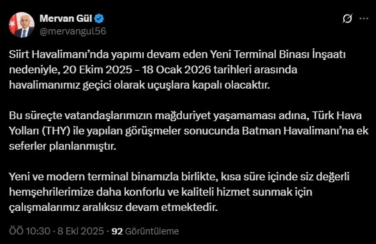 Milletvekili Gül, sosyal medya hesabı X (Twitter) üzerinden yaptığı paylaşımda, 20 Ekim 2025 - 18 Ocak 2026 tarihleri arasında Siirt Havalimanı’nda uçuşların durdurulacağını belirtti.