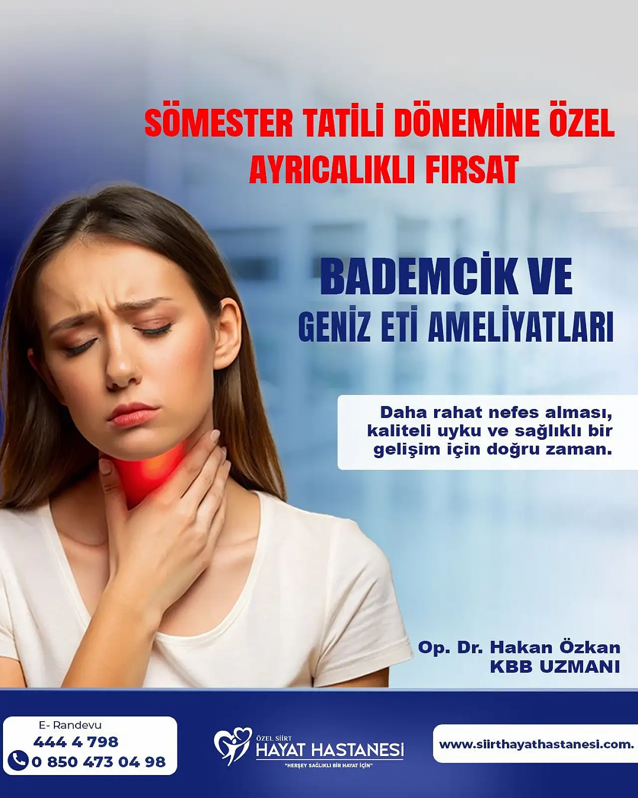Özel Siirt Hayat Hastanesi, sömestr tatili dönemine özel olarak bademcik ve geniz eti ameliyatları için ayrıcalıklı bir uygulama başlattı.