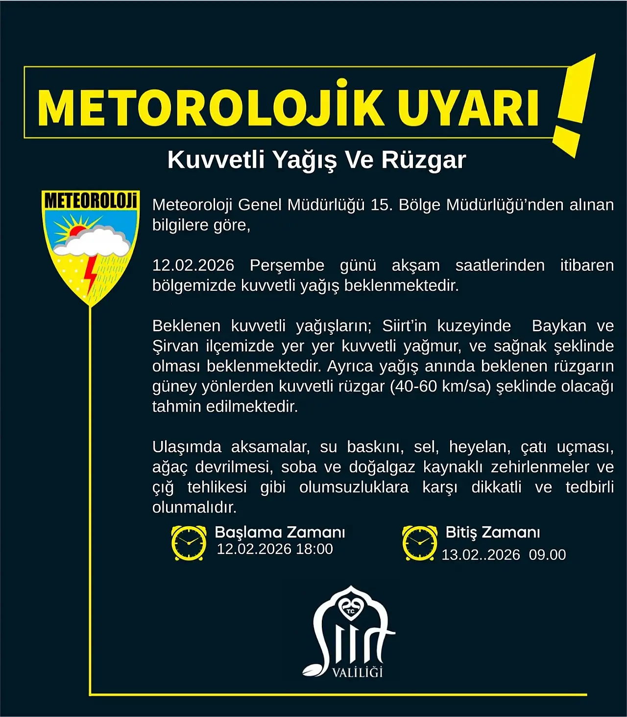 Siirt Valiliği, Meteoroloji'den alınan son veriler doğrultusunda kent genelini ilgilendiren kuvvetli yağış ve rüzgâr uyarısında bulundu. Baykan ve Şirvan başta olmak üzere birçok bölgede olumsuzluklara karşı dikkatli olunması istendi.