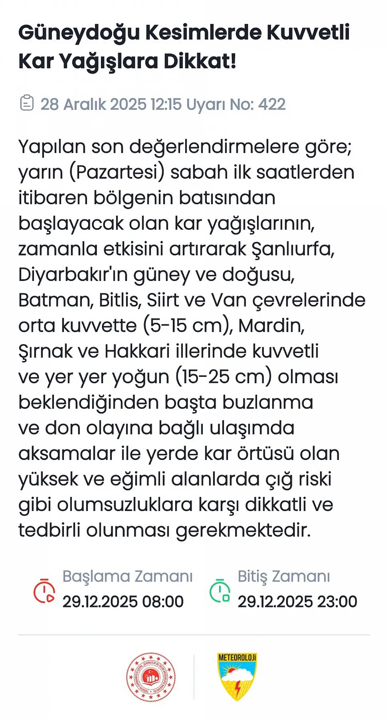 Yetkililer, zorunlu olmadıkça özel araçlarla trafiğe çıkılmamasını, çıkanların ise zincir, çekme halatı ve kış lastiği gibi önlemleri almasını önerdi. Kar yağışı uyarısının 29 Aralık 2025 saat 08.00’de başlayacağı ve aynı gün saat 23.00’e kadar etkili olmasının beklendiği bildirildi.