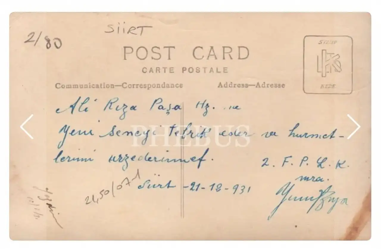 Siirtli fotoğraf koleksiyoneri Faik Kuzu, 21 Aralık 1931 tarihli Ali Rıza Paşa'ya ithaflı tebrik kartını paylaştı. Kartta dönemin Siirt görüntüleri dikkat çekiyor.