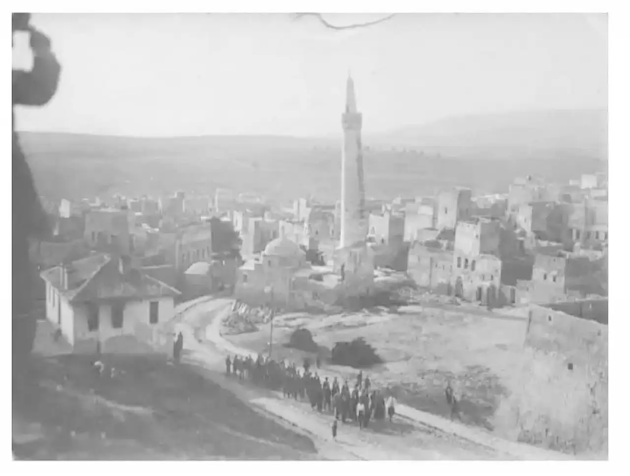 Kartta, sağda Babudarp Camisi ve minaresi, solda ise dönemin askeri fırın binası görülüyor. Fotoğrafın, kalabalık bir milli bayram dönüşünde çekilmiş olabileceği değerlendiriliyor. Ayrıca kadrajın sol kısmında muhtemelen askeri ya da sivil bir yetkilinin şapka veya kasketi dikkat çekiyor.